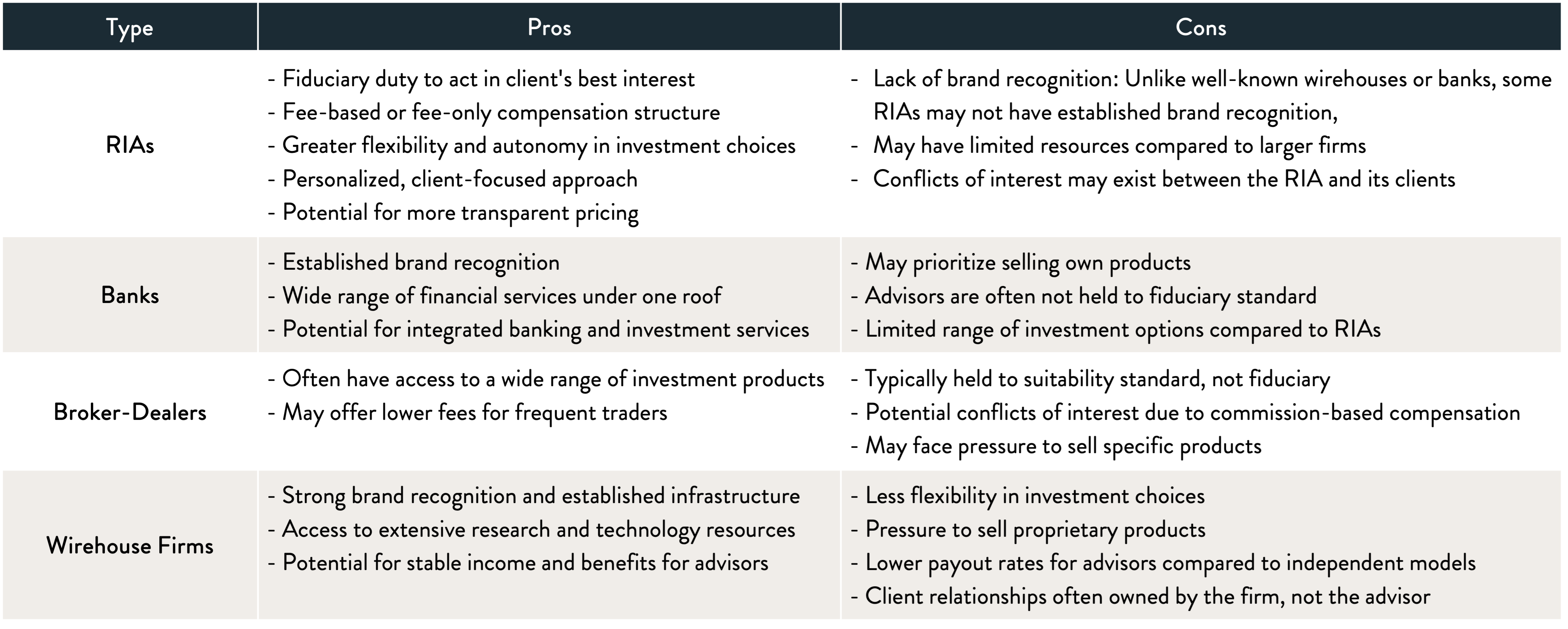 These firms execute trades on behalf of clients. Brokers are often compensated through commissions on the products they sell. This can create a potential conflict of interest, as they may be incentivized to recommend products that generate higher commissions, rather than those that are best suited for the client. Broker-dealers are held to a “suitability” standard, which means the investment needs to be suitable for the client, which is a lower standard than acting in the client’s best interest.