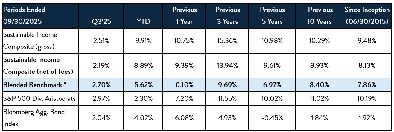 U.S. equities performed well in Q3 2025, with the S&P 500 up by +7.7%. However, the recent artificial intelligence race has captivated investors, skewing returns toward technology and away from traditional dividend-paying equities. Fixed income returns were strong as bond prices benefitted from the Federal Reserve’s decision to cut interest rates in September. Against this backdrop, Summitry’s Sustainable Income strategy produced a return of +2.2%, bringing year to date returns to +8.9%, net after fees. While the Sustainable Income Composite did modestly underperform its blended benchmark in Q3, it has outperformed in every other period.