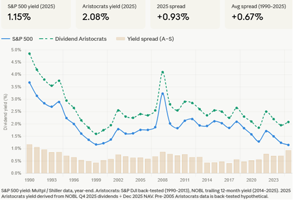 Over the long term, the broad market has outperformed the Aristocrats, with the S&P 500 producing a 10-year annualized return of +14.7% as compared to an annualized return for the Aristocrats of +10.0%. We think that investors should expect a continuation of this outperformance over full market cycles, since the most dynamic and fastest growing companies in the economy generally do not have the long track records of dividend payments what would qualify them for the Dividend Aristocrats index. The purpose, therefore, of having exposure to a dividend-focused portfolio is different: